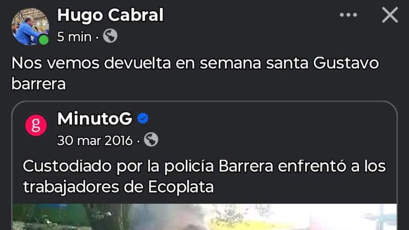 ¿Por qué surgen estas situaciones? Todo el posible revuelo se arma luego de que el delegado de los trabajadores de Santa Elena, Hugo Cabral, publicara en sus redes sociales una foto de Gustavo Barrera en medio de los trabajadores, anunciando: "Nos veremos de vuelta, Gustavo Barrera". El propio Cabral fue quien en el mismo medio había anunciado el principio del conflicto y la salida a la calle de los camioneros, por eso es que se entiende que esto podría ser el puntapié de un nuevo conflicto.
