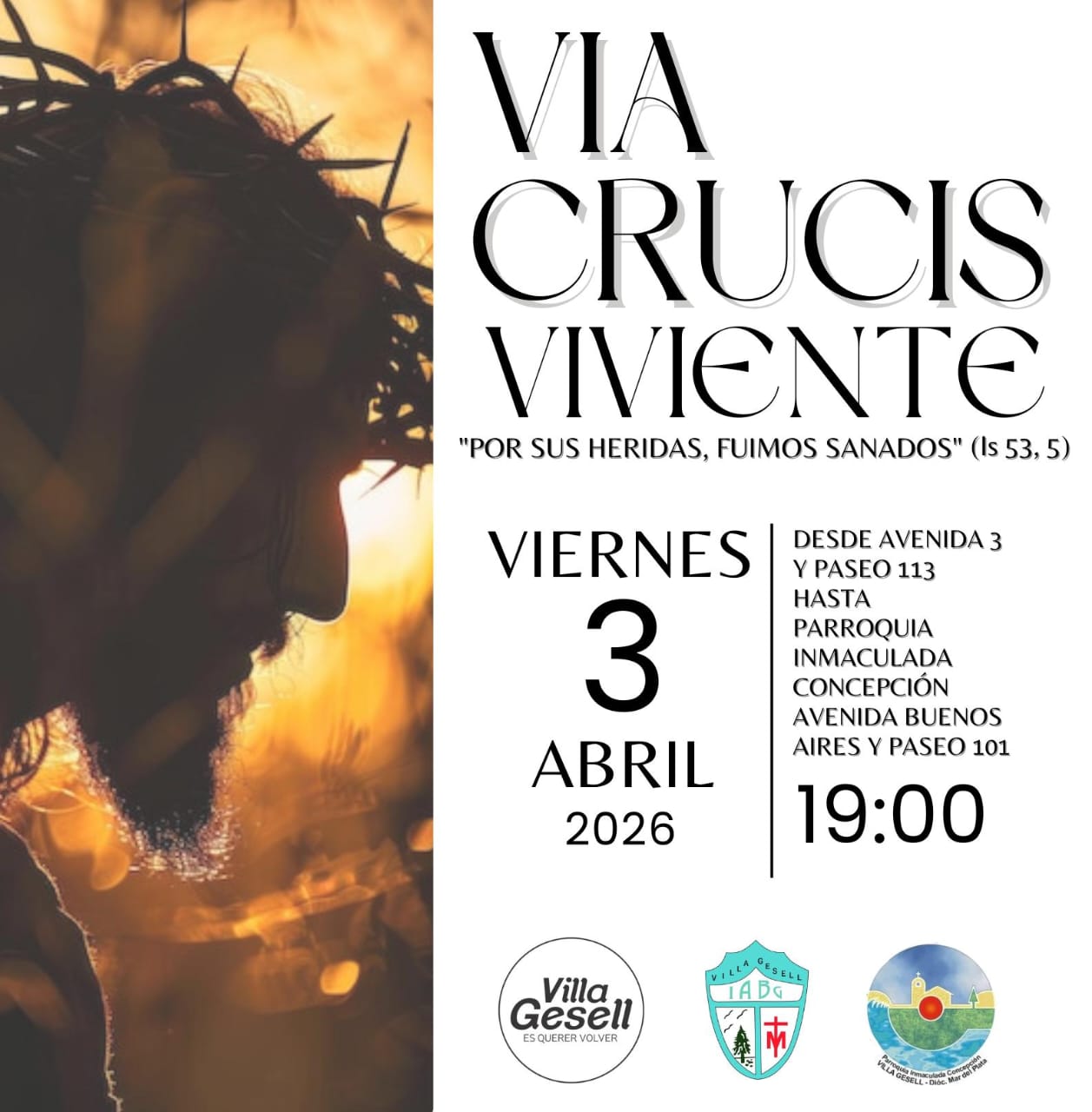 19:00: Vía Crucis Viviente. Bajo el lema "Por sus heridas, fuimos sanados" (Is 53, 5), se llevará a cabo esta solemne conmemoración. El punto de encuentro será en Avenida 3 y Paseo 113, con destino final en la Parroquia Inmaculada Concepción.
