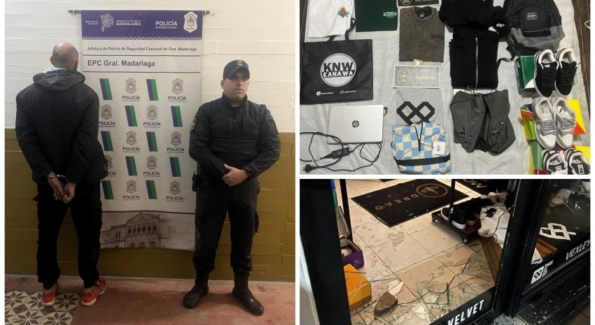 El segundo episodio se registró durante la madrugada en un comercio de indumentaria ubicado en calle Dr. Carlos Madariaga entre Mitre y Belgrano. Tras recibir un alerta por ruidos de rotura de vidrios, personal policial constató el daño en el local y logró divisar a pocos metros a un hombre de 32 años que intentaba huir con una bolsa de consorcio. En su interior llevaba ropa, zapatillas y una computadora que había sustraído del negocio. Los elementos fueron reconocidos por el dueño del comercio y el sospechoso quedó demorado.