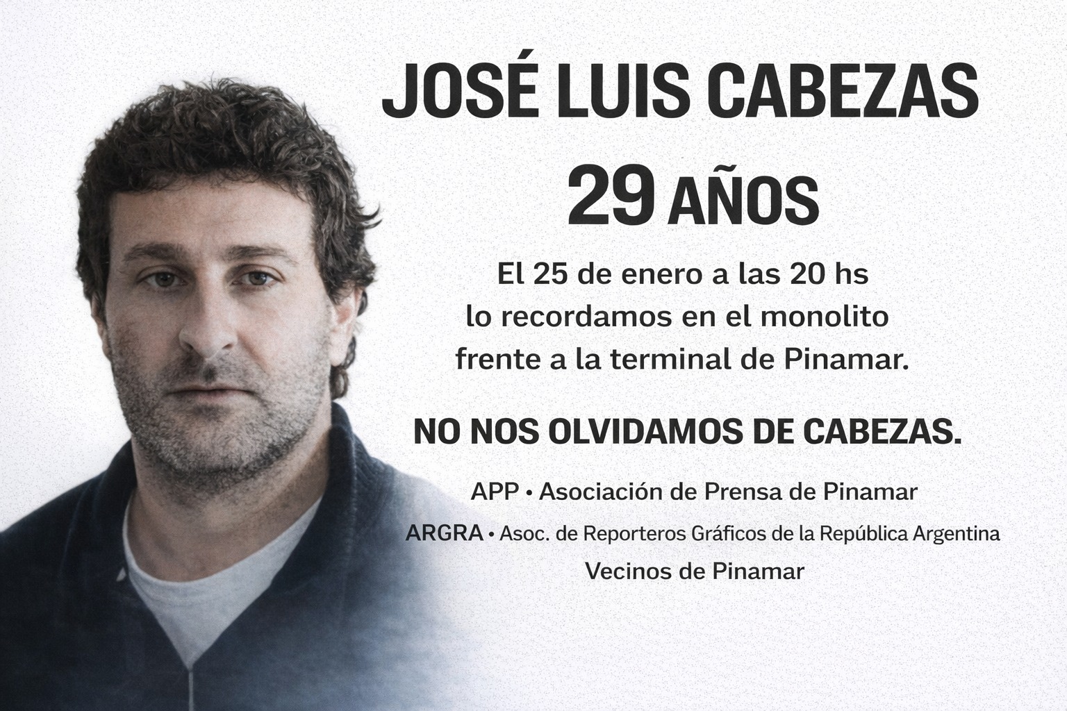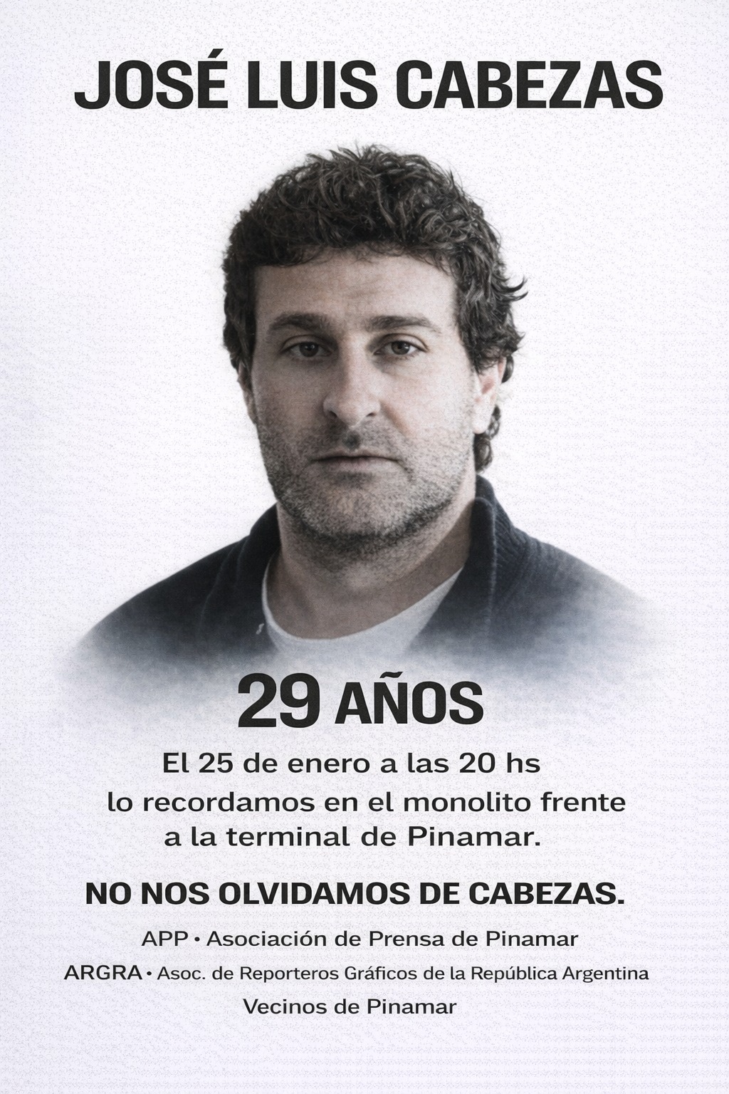En tanto, como ocurre desde hace 29 años, los vecinos de Pinamar autoconvocados invitaron a la comunidad al acto de Cabezas para las 20 horas. Como todos los años, comprometieron su participación representantes de ARGRA, el gremio de reporteros gráficos de la Argentina, entidades intermedias, sindicatos, guardavidas, gente de la cultura entre otros.