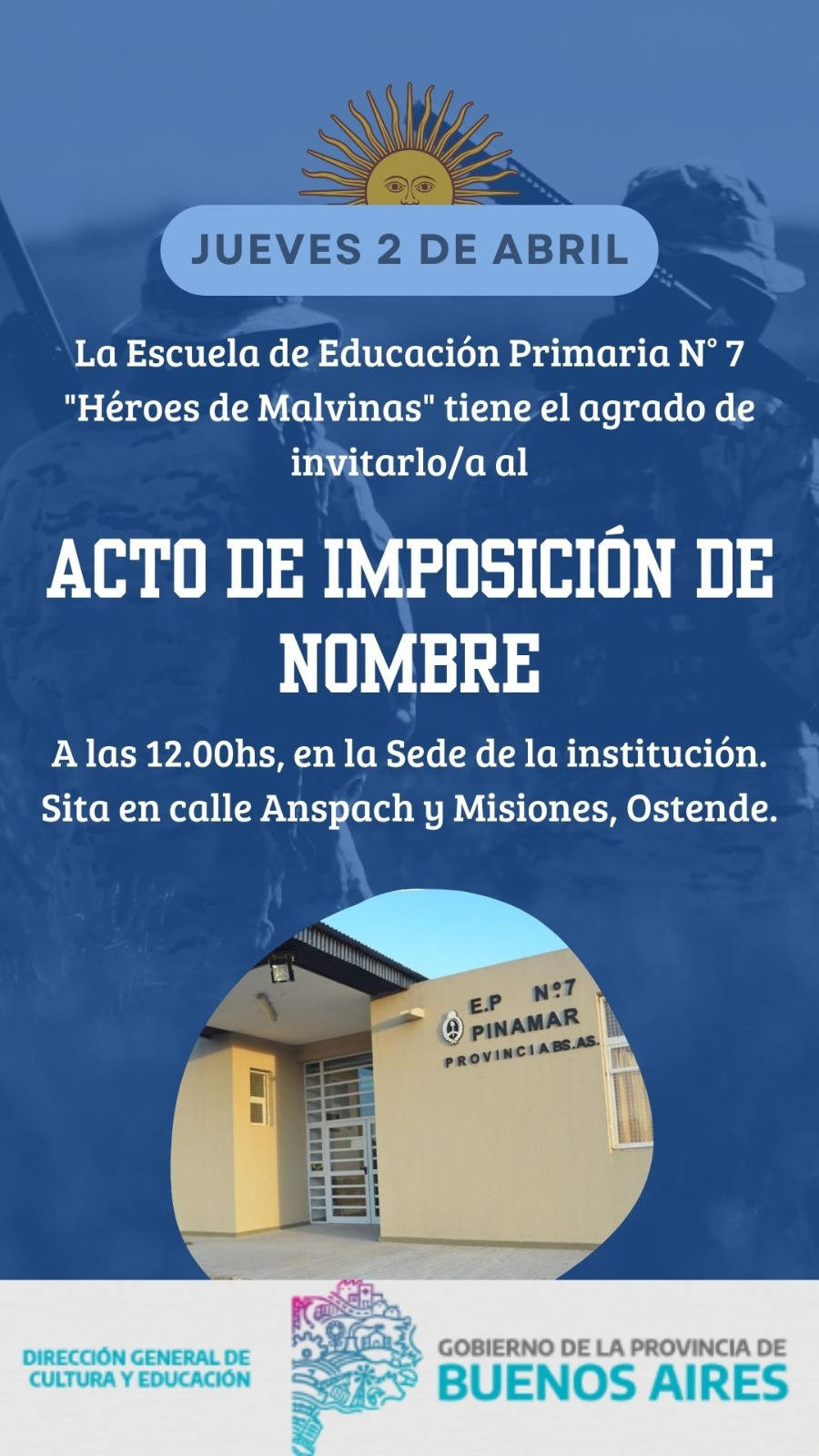 Al término del Acto Oficial del 2 de Abril, convocamos a los presentes a participar del Acto de Imposición de Nombre de la Escuela de Educación Primaria N° 7 "Héroes de Malvinas".
