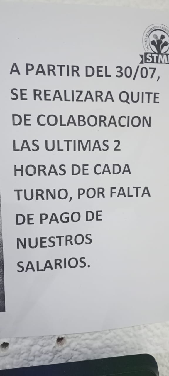 Frente a esta situación, y cumpliendo con todos los requisitos legales, el STMP comunicó la implementación de una medida de fuerza consistente en un quite de colaboración durante las últimas 2 horas de cada turno, a partir del 30 de julio.
