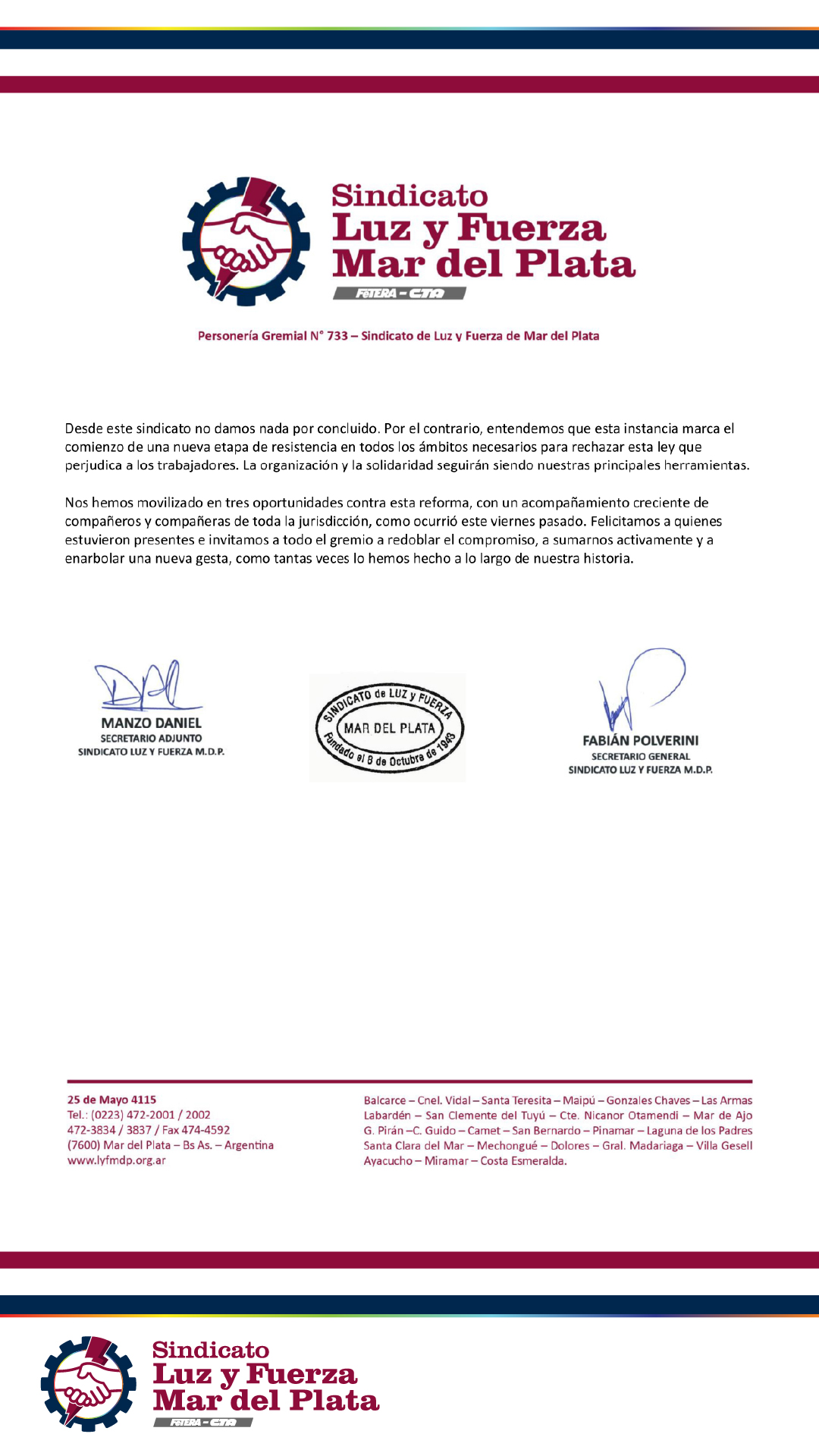 El comunicado lleva las firmas de Daniel Manzo (Secretario Adjunto) y Fabián Polverini (Secretario General) del Sindicato Luz y Fuerza Mar del Plata.