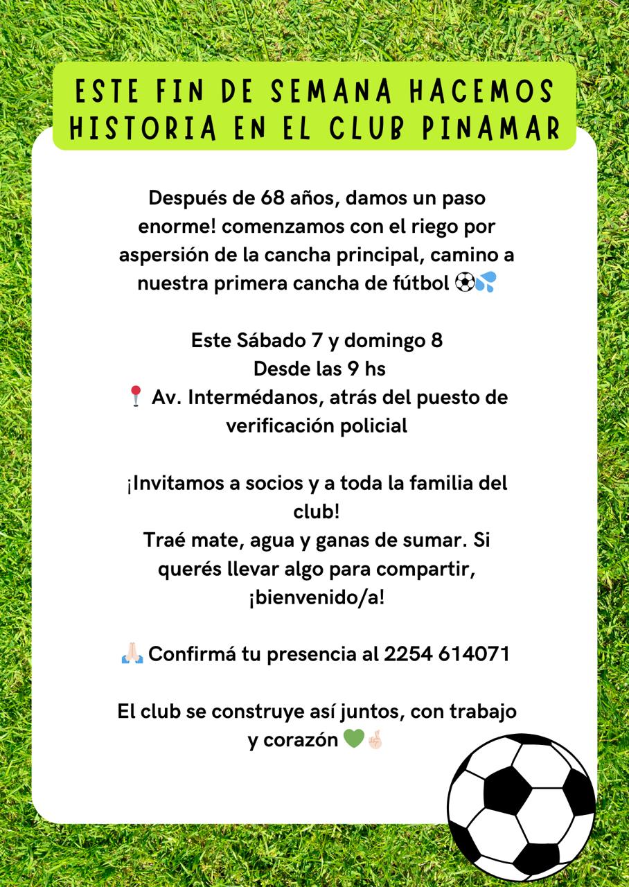 “Queremos invitar a todos los socios y a toda la comunidad de Pinamar a reunirnos este sábado y domingo a las 9 de la mañana” dijo Claudio Ponce, presidente de la entidad. “Por suerte quedan las últimas etapas, que es el riego por aspersión de la cancha principal y la de infantiles. Ya compramos todo el material del riego, así que invitamos a todas las amigas, los amigos, papás, mamás, socios, que vayan con el mate, con agua, vamos a necesitar palas y varias cositas. Porque falta poquito para hacer historia.”