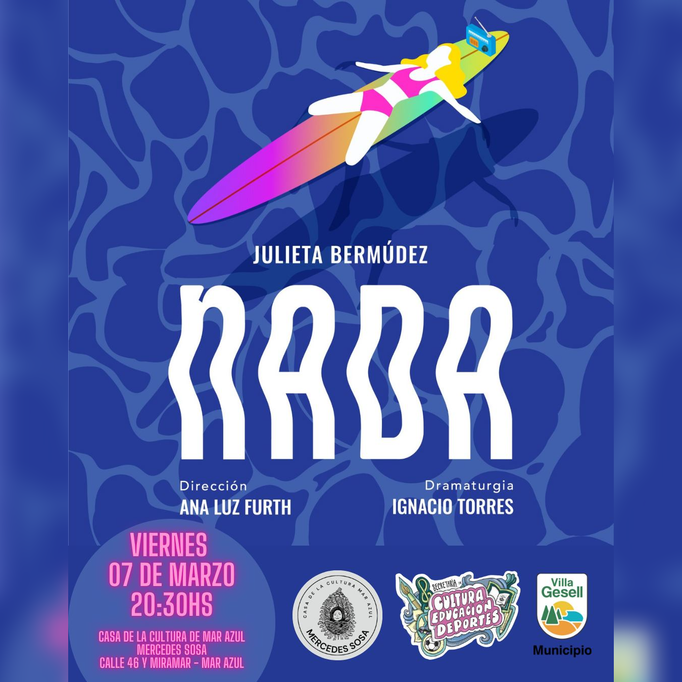 Para el cierre de la jornada, a las 20 hs. en el Centro Cultural Pipach, se presentará nuevamente la obra teatral Nada, un unipersonal dirigido por Ana Luz Furth. La obra narra la historia de una surfista a la deriva, un pez, una sirena, una guardavidas post-apocalíptica o, simplemente, una mujer en medio de su propio oleaje de pensamientos. Nada propone un viaje singular a través de la piel de estos seres para, quizás, tomar conciencia y escuchar el rugido del mar.