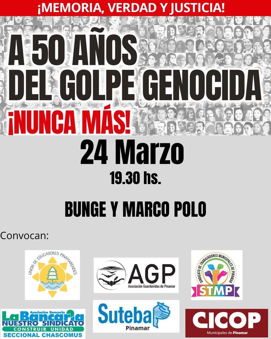 A 50 años del golpe, la jornada invita a mantener viva la memoria de los 30.000 detenidos desaparecidos, a fortalecer la lucha por verdad y justicia, y a defender la democracia como conquista irrenunciable del pueblo argentino.