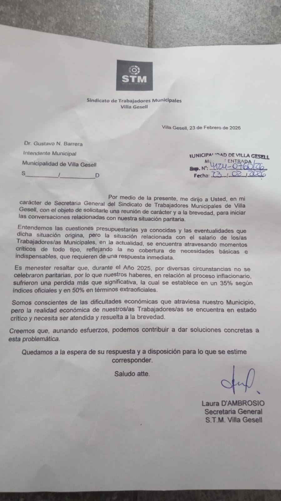 A una semana de asumir, el gremio que lidera Laura Dambrosio presentó un pedido formal al Ejecutivo para negociar aumentos salariales y recomposiciones del año pasado. Desde el sindicato advierten que la situación "requiere respuestas inmediatas", aunque el gobierno municipal condiciona cualquier acuerdo a la aprobación del presupuesto.