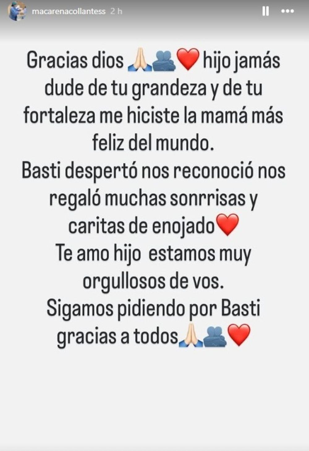 Mediante sus redes sociales, Macarena Collantes expresó: “Hijo, jamás dudé de tu fortaleza”. Bastián Jerez está internado desde el 12 de enero, cuando sufrió un grave accidente en los médanos de Pinamar.