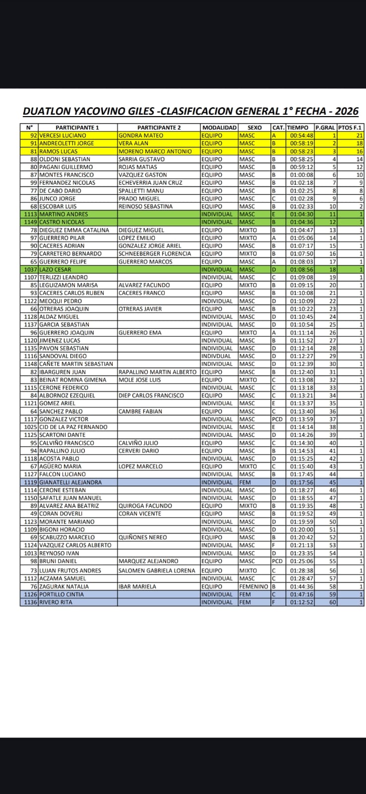 El duatlón marcó el inicio de su calendario 2026 con la disputa de la primera fecha del Campeonato Yacovino Giles, que tuvo lugar este fin de semana. La dupla integrada por el madariaguense Mateo Gondra y el pinamarense Luciano Vercesi se consagró campeona en la clasificación general, con un tiempo de 54 minutos y 48 segundos.