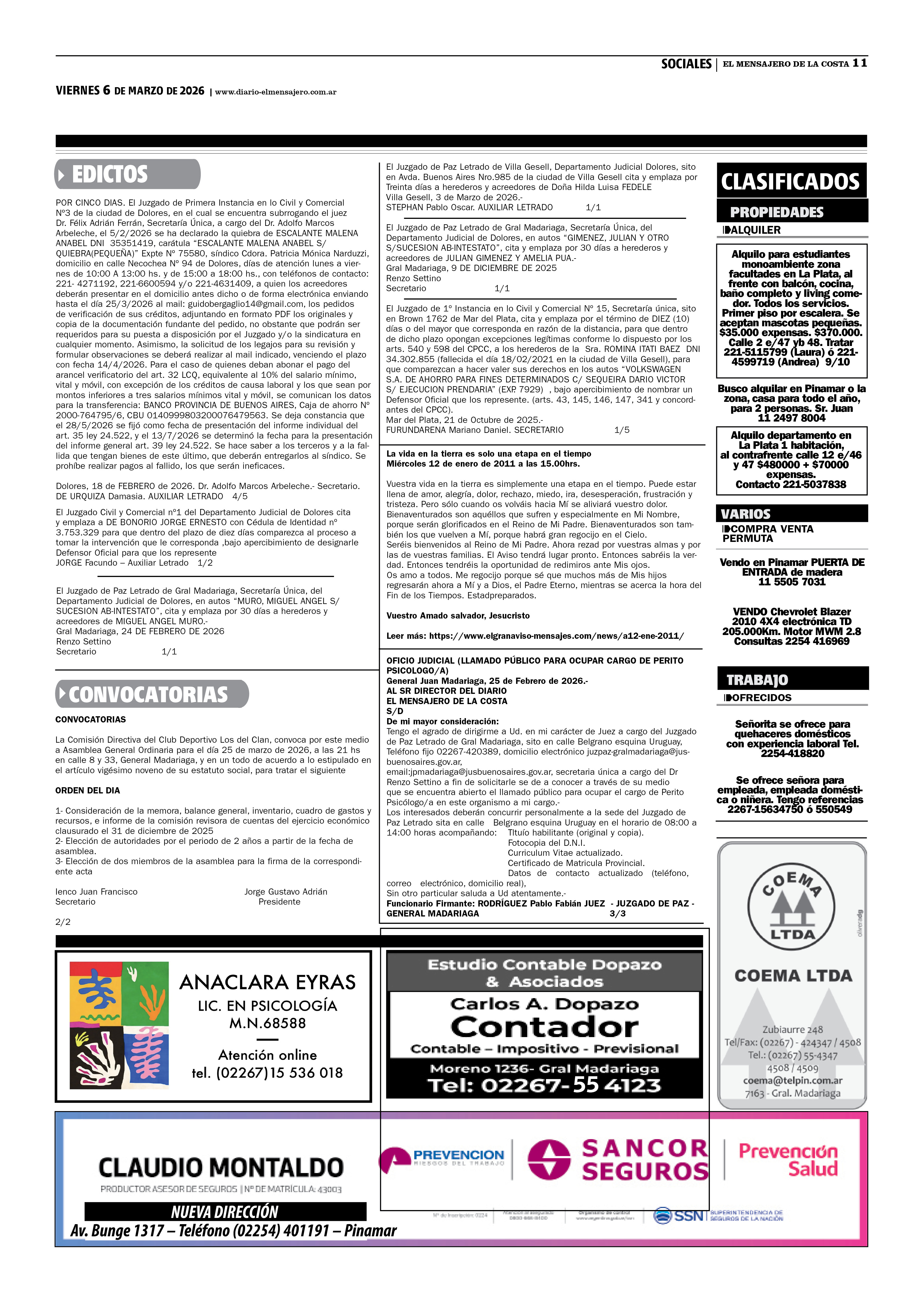 FALLECIMIENTOS Este lunes 05/01/2025 falleció en General Madariaga, el vecino Juan Carlos Curutchet, a los 84 años de edad. Sus restos serán cremados hoy en Madariaga. Servicio Casa Meoqui.